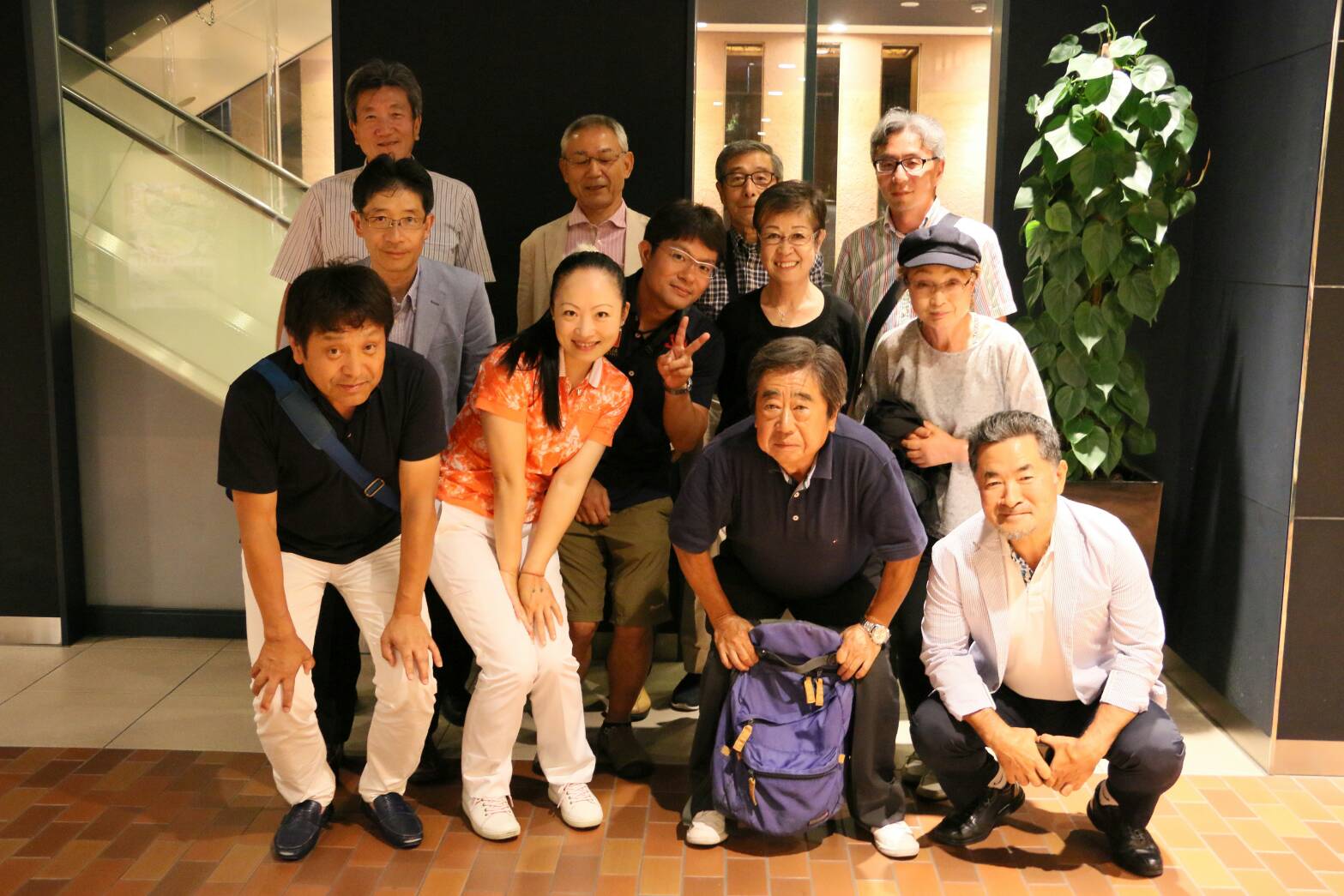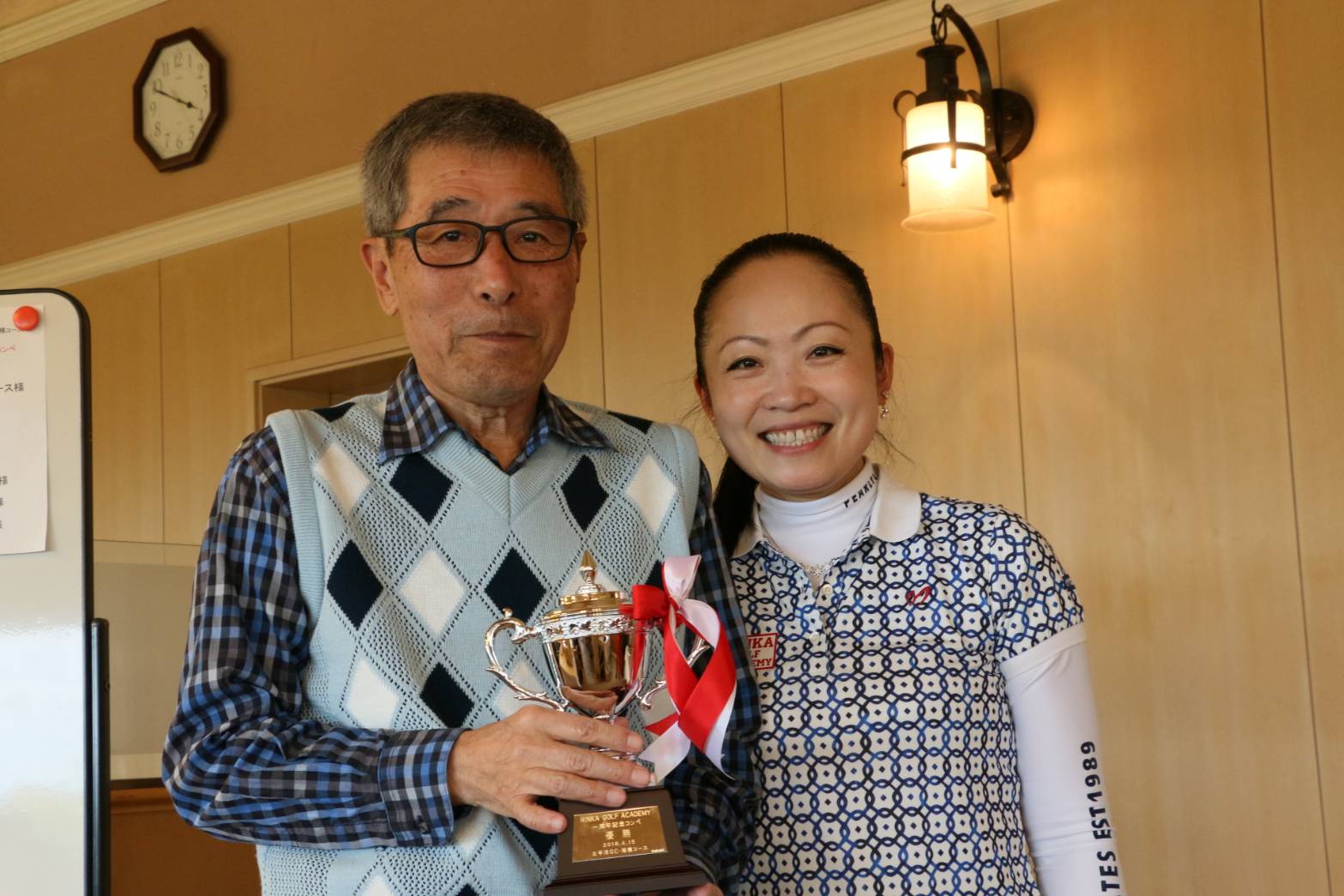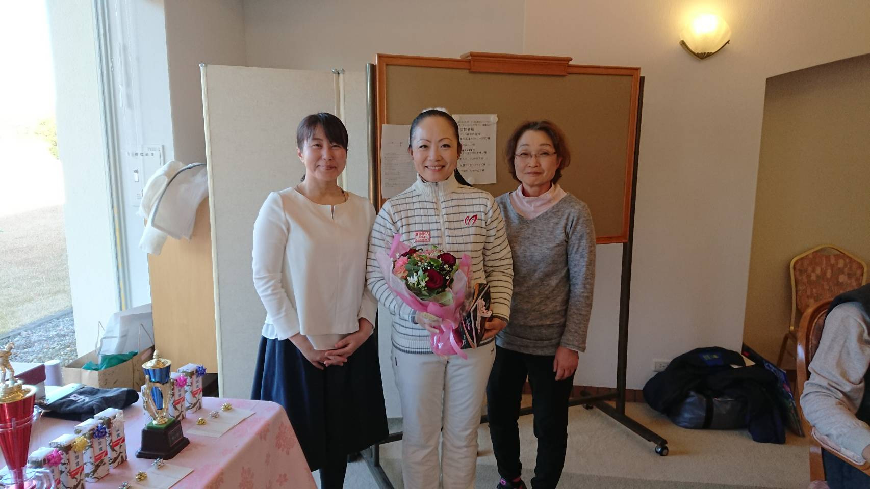 今回は 5 組、 17 名の参加で天候にも恵まれ参加者全員日頃のレッスンの成果を試すべくナイスショットもそうでないショットも楽しんでプレーされておりました。前回のコンペの時よりも皆さん腕前もかなり上達されており、熱戦を繰り広げられました。大会も無事に終了できプレゼンテーションでは豪華なトロフィーと景品が入賞者に贈られ、その中でも生徒さん皆様からいただいたサプライズプレゼントには本当にびっくりしてとても嬉しかったです。写真はその際に女性参加者から頂いた時のスナップです。