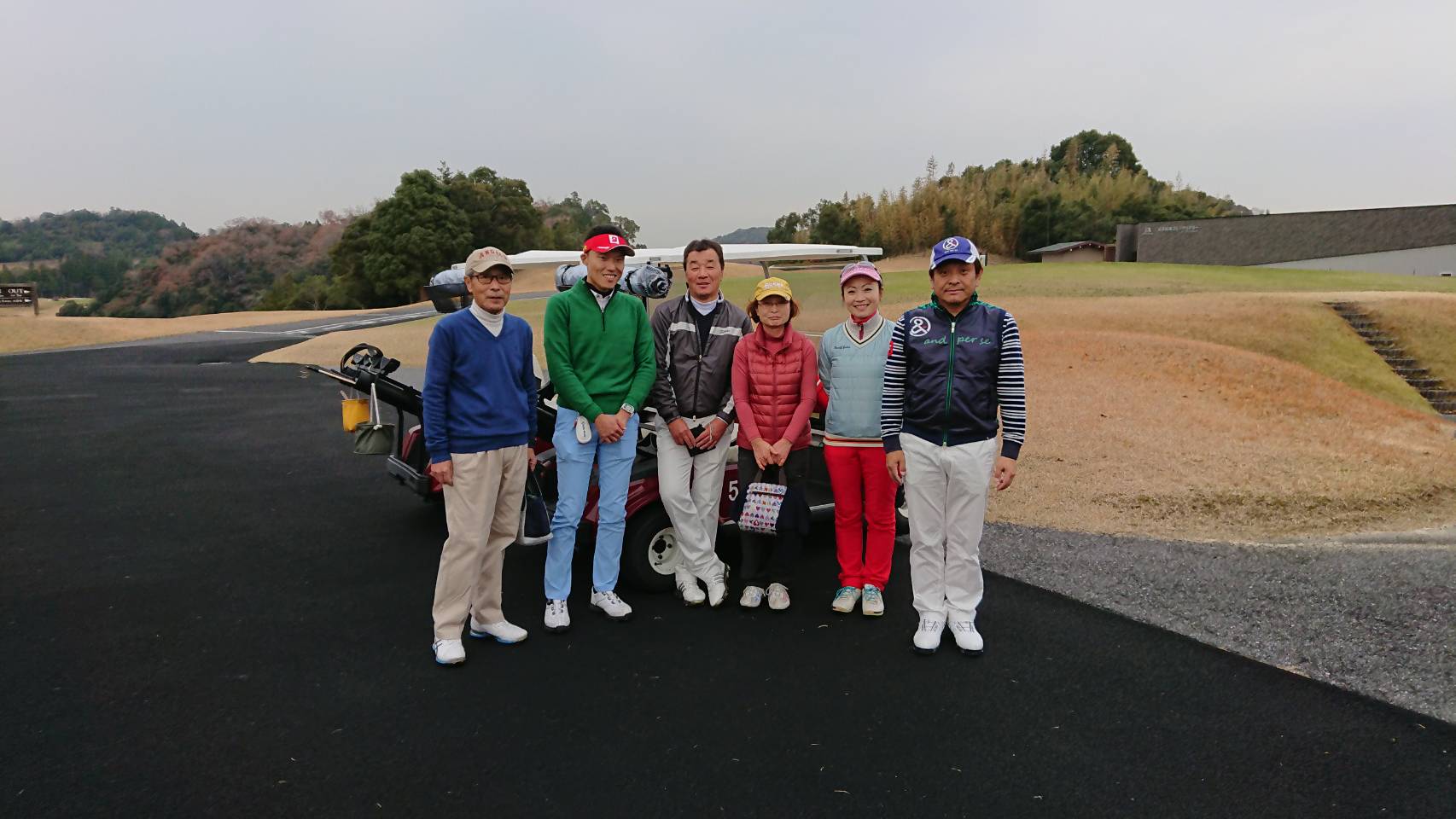 ☂️の中のランドレッスンでした。午前中はアプローチの練習後、エキストラホールを回って、昼食後は本コースの9ホールを回りました、それぞれ自分の課題を見つけました。ゴルフ場側がカートを貸してくださったので、何と5人一緒にランドしました。雨でしたが、生徒さん達の真剣さ、それに笑顔、最高でした️