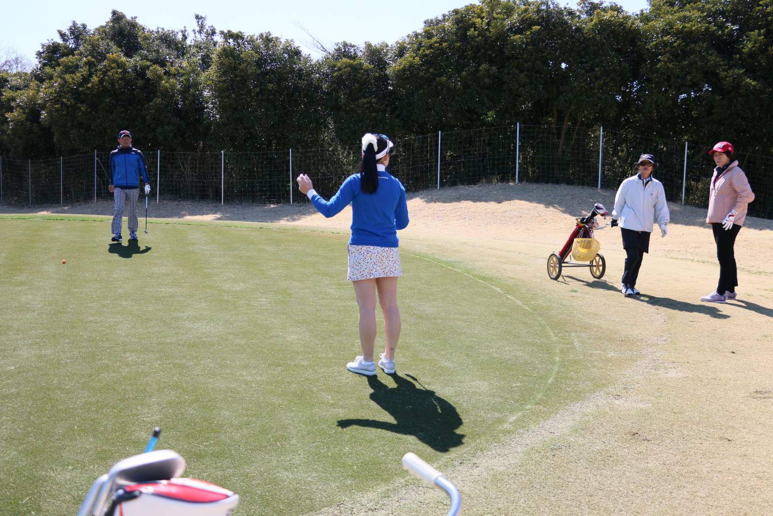 暖かい陽気で、身体も動きやすかったです。スタートより早い時間から始めました、皆様意欲的で素晴らしいです。午前中は芝生の上の練習、グリーン回り、30ヤードのアプローチ、150ヤード前後のショット、ドライバー。午後はアウトの9ホール回って、内容満載の1日でした。大満足と生徒さん達から声を頂きました。